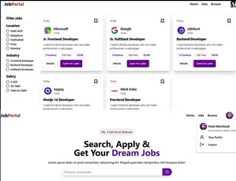 Job discovery and application platform built using the MERN stack, enabling users to browse jobs, apply seamlessly, and manage applications through a clean dashboard.